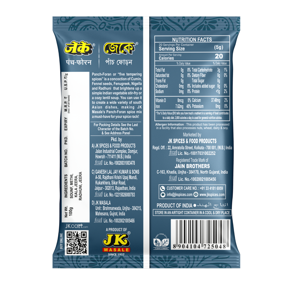 Pre made whole spice, known for the quick popping sound it makes the moment its thrown in a hot pan when swirled with ghee or oil. Five spices put together to create a burst of flavours which is non spicy and adapts to any style of cooking.